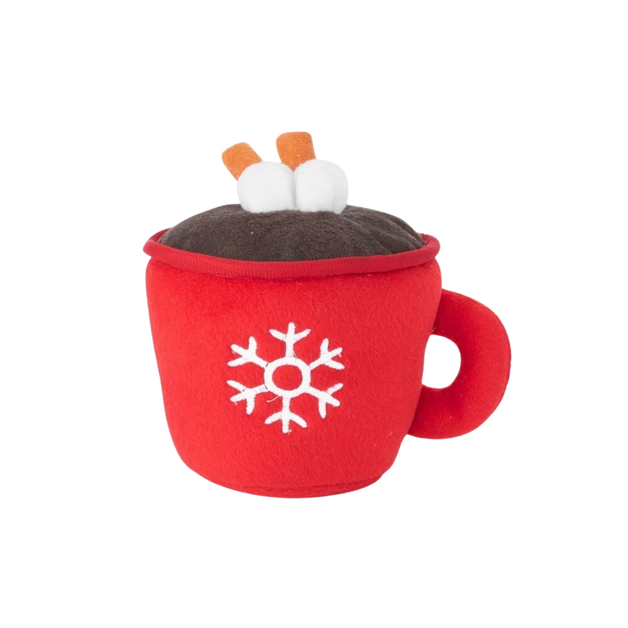 The Holiday Hot Cocoa features topping details, an embroidered snowflake, and includes 2 round squeakers.