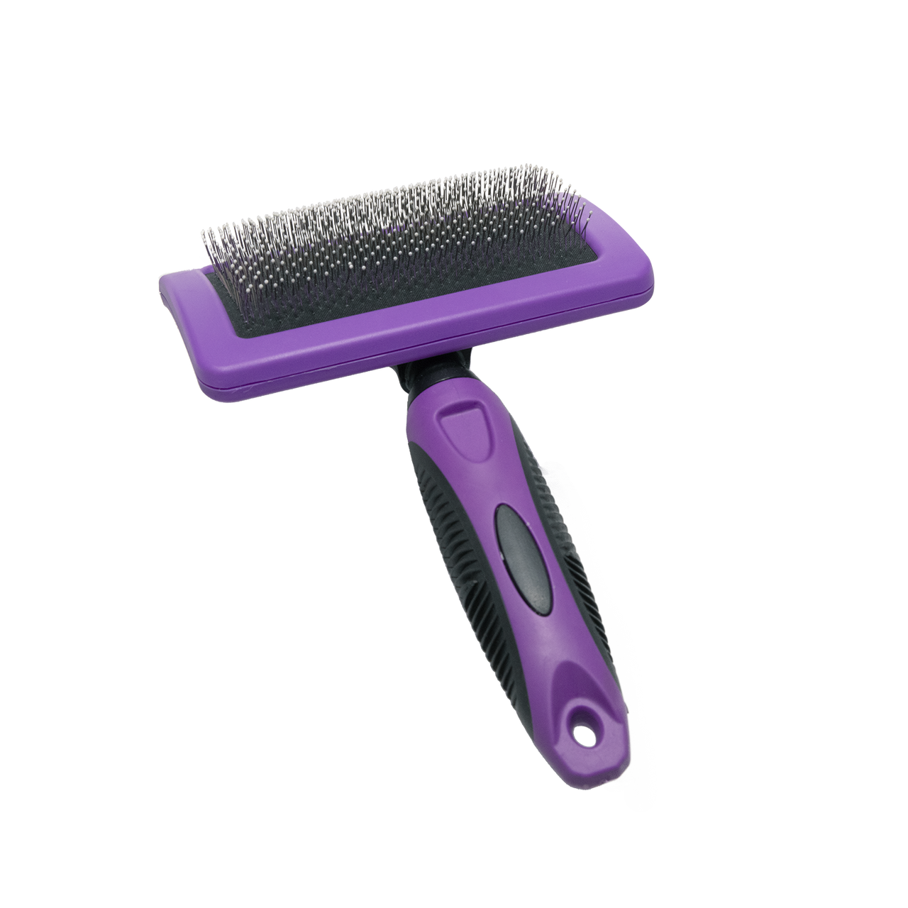 The large SureGrip Ball Tip Curved Slicker Brush is designed for gentle, effective grooming. Its ball-tipped bristles detangle and remove loose hair without irritating skin, while the curved head reaches tricky areas—perfect for smaller pets or delicate grooming. The ergonomic SureGrip handle provides comfort and control, reducing hand fatigue. Ideal for daily use, it keeps your pet’s coat healthy, smooth, and tangle-free.