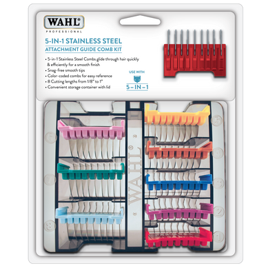 Wahl 5-in-1 Stainless Steel Attachment Comb Set features all eight sizes of the Wahl 5-in-1 Guidecombs. Includes 1/8-inch, 1/4-inch, 3/8-inch, 1/2-inch, 5/8-inch, 3/4-inch, 7/8-inch and 1-inch.