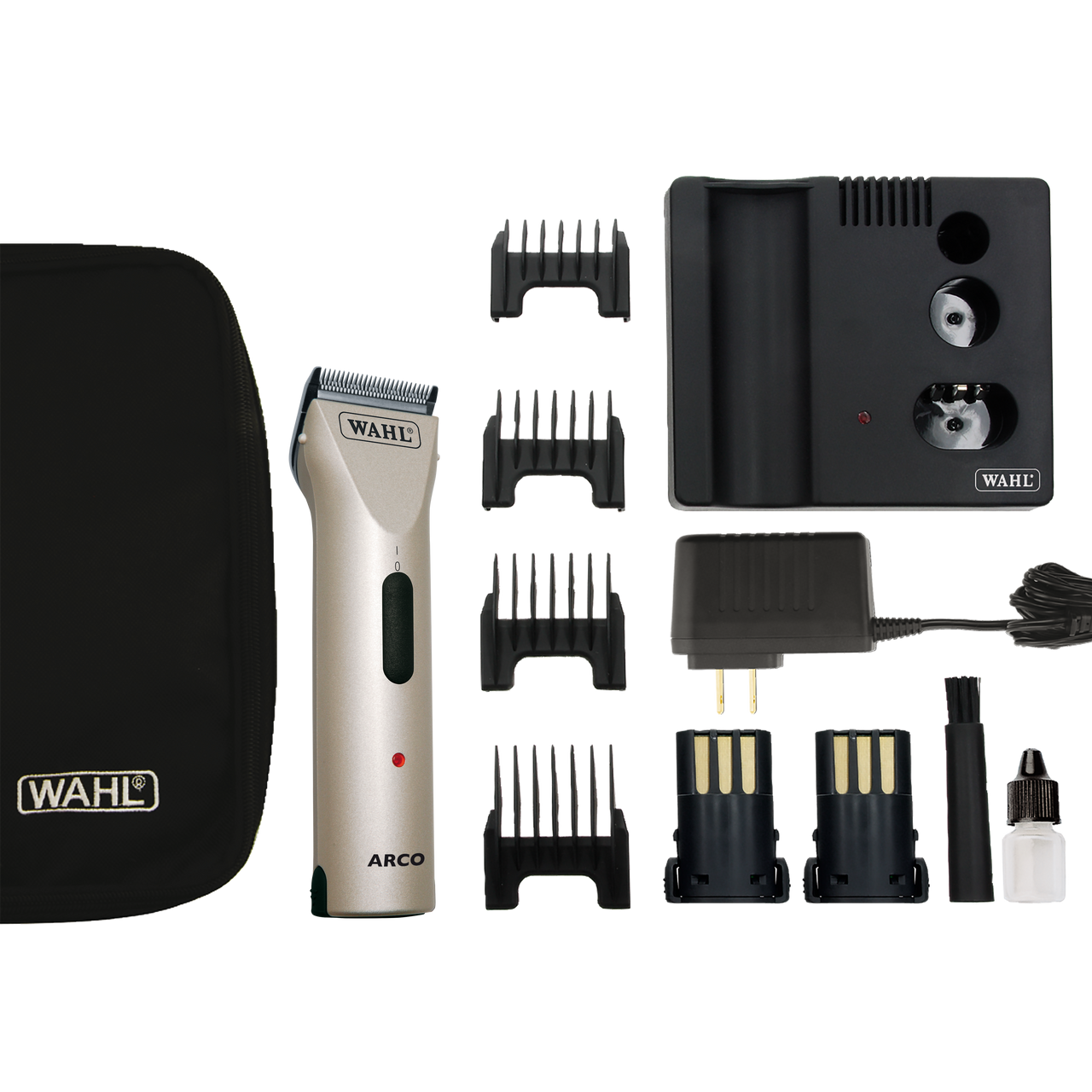 Ideal for faces, paw pads and sanitary trims, the Wahl Arco is a cordless, lightweight clipper weighing just 7.9 oz. It runs at 5,500 SPM and features a 5-in-1 adjustable fine blade (#9–#40). Two rechargeable batteries provide up to 80 minutes of runtime each, allowing continuous use by swapping between them. Also available in color Purple with Paw Prints.
